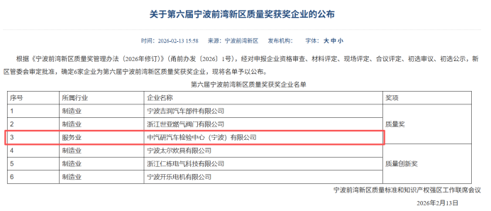 2月13日,第六屆寧波前灣新區質量獎獲獎企業公布,中汽研汽車檢驗中心(寧波)有限公司(以下簡稱“寧波檢驗中心”)憑借卓越的質量管理水平、突出的自主創新能力、顯著的經濟社會效益成為唯一一家斬獲該項殊榮的服務業企業。