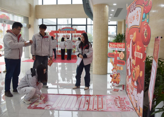 火紅的燈籠下,一條條精心準備的燈謎隨風輕擺。謎題包羅萬象,從傳統文化到行業知識,妙趣橫生。看—有人仰頭讀題,有人低頭沉思,有人組團“頭腦風暴”。謎底揭曉的瞬間,歡呼聲此起彼伏,智慧的火花點燃了整個節日的氛圍。