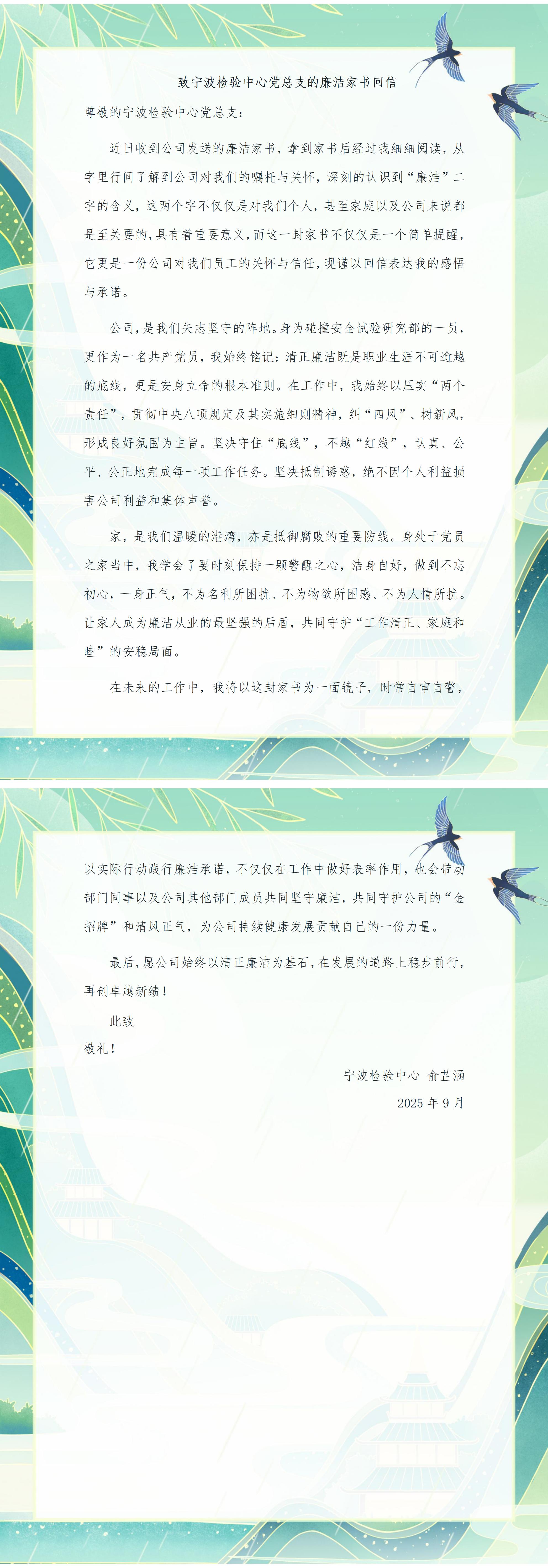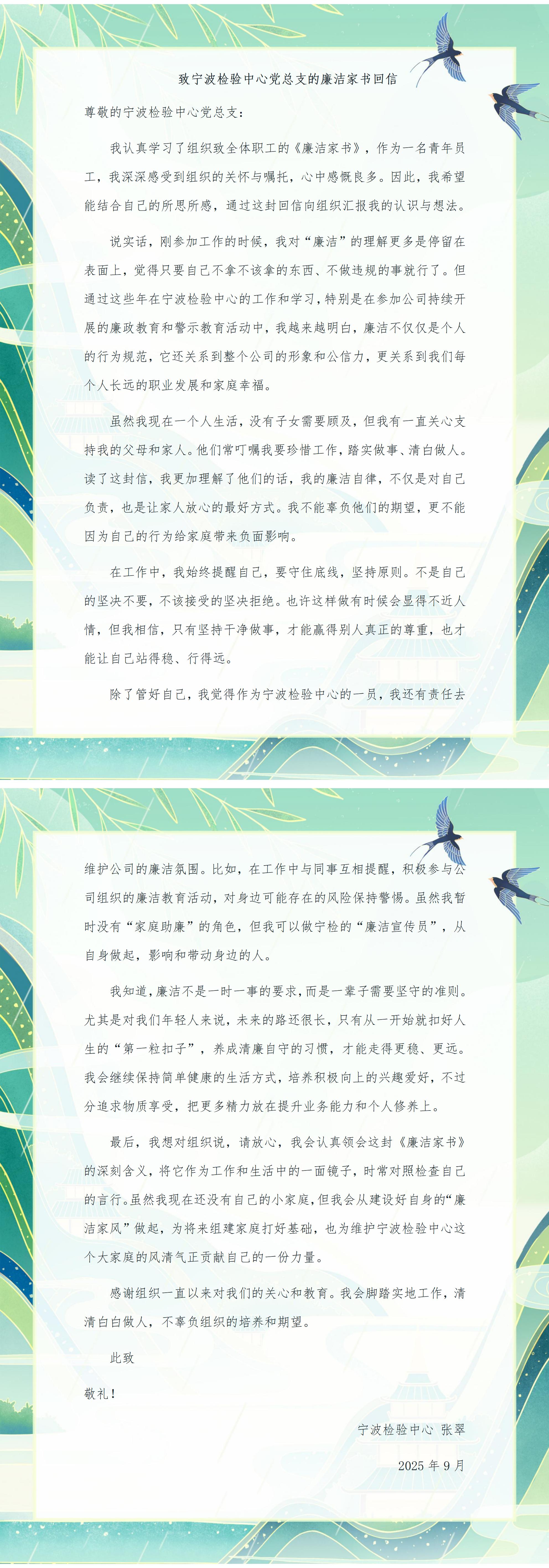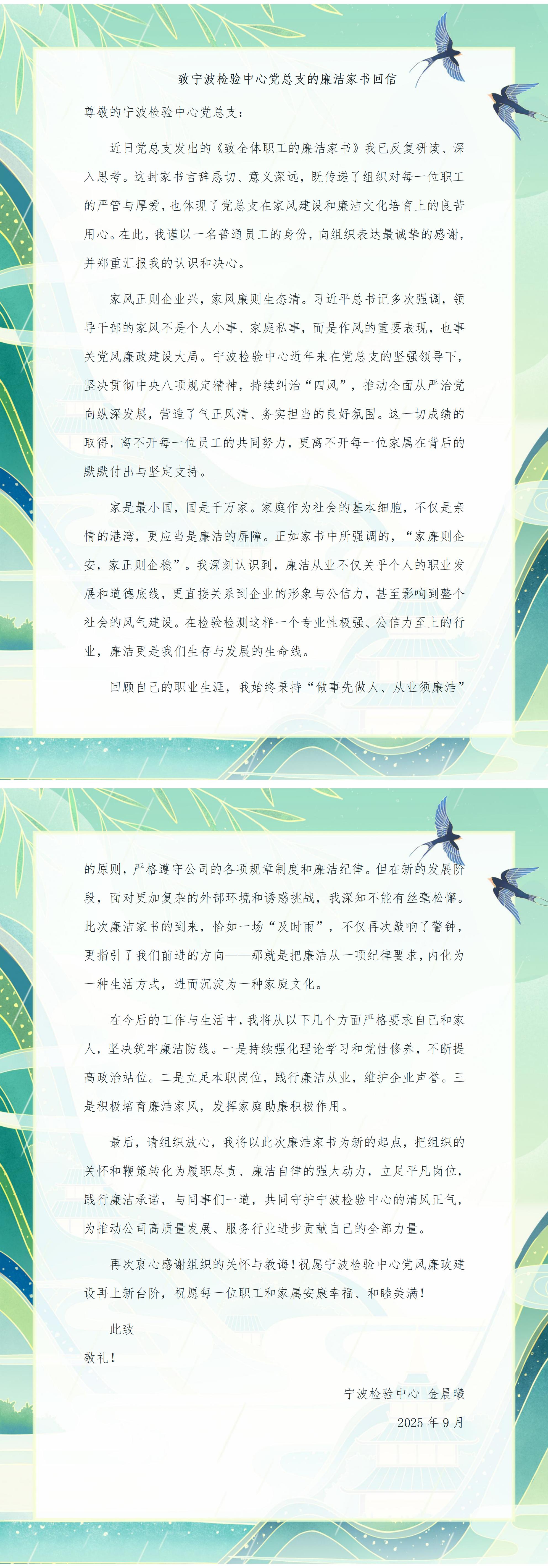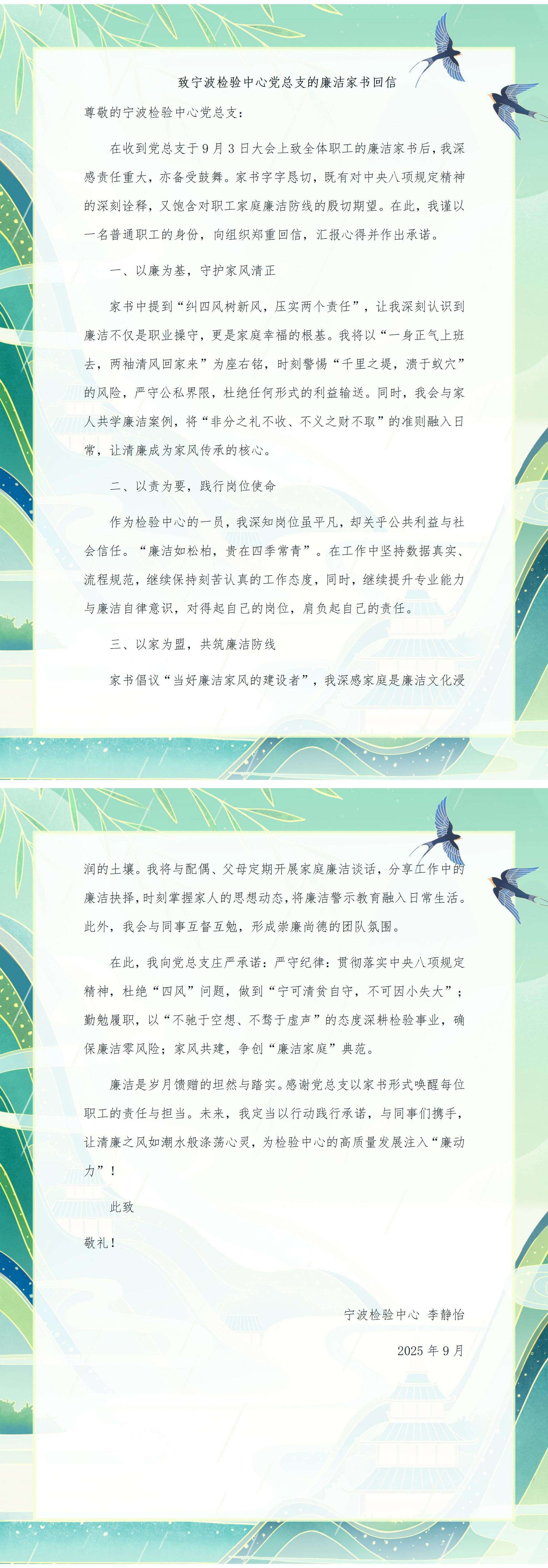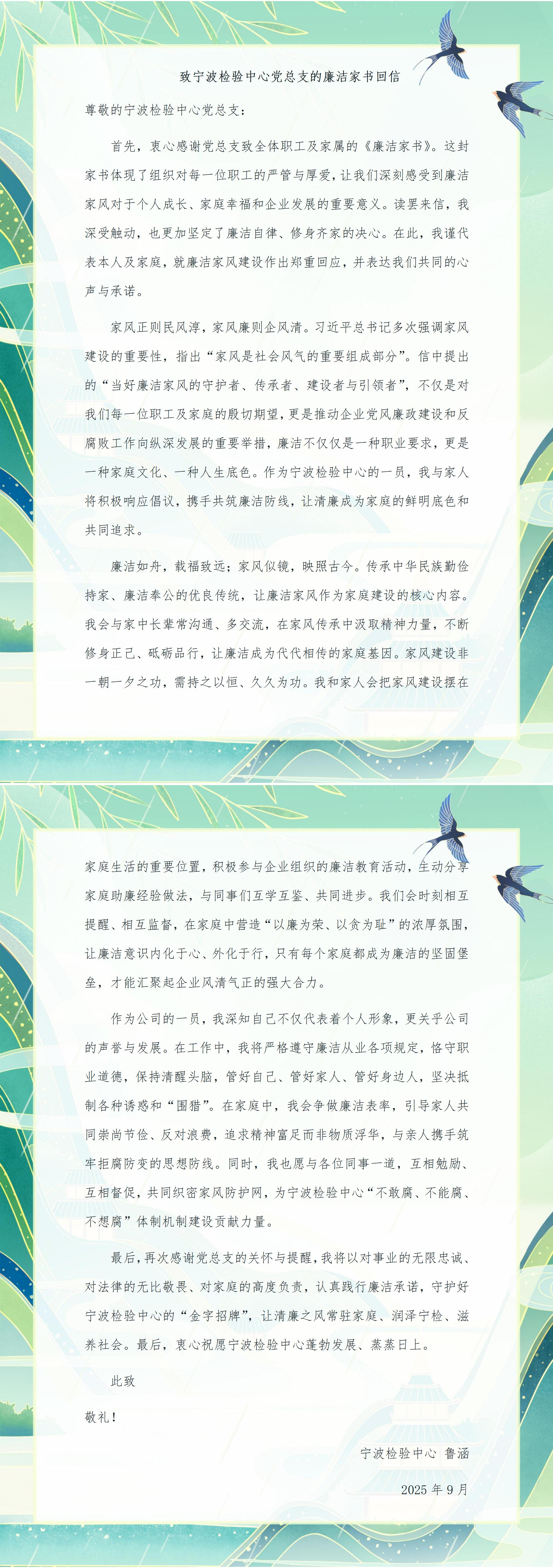 為深入貫徹習近平總書記關于注重家庭家教家風建設的重要論述,落實中心“廉政宣傳月”活動部署舉措,推動廉潔文化浸潤家庭、滋養人心,引導廣大職工及家屬筑牢拒腐防變的家庭防線。9月3日,寧波檢驗中心向全體職工發送了《廉潔家書》。